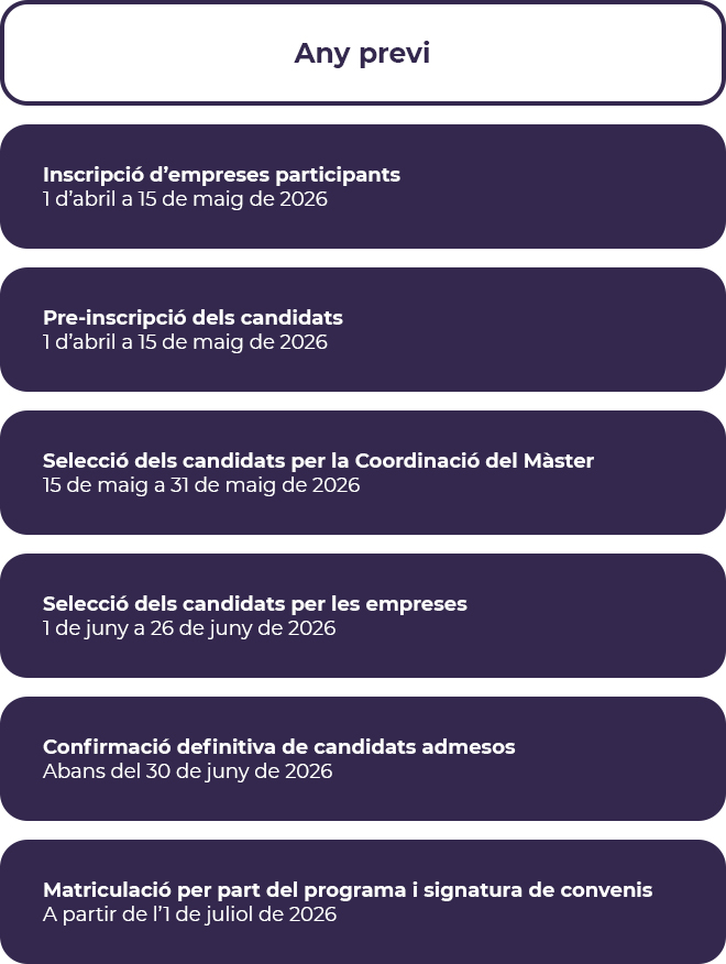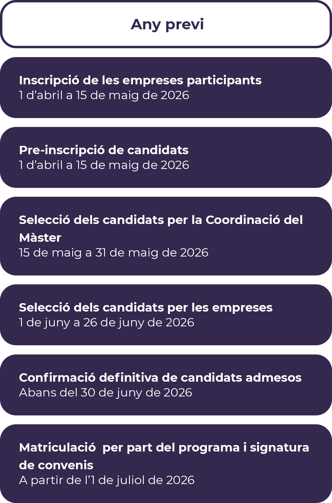 Els candidats, en el moment de ser informats de la seva admissió en el programa, hauran de signar i enviar immediatament a la Coordinació un compromís d’acceptació de la plaça que se’ls ofereix. Aquest compromís és indispensable per formalitzar l’acceptació, informar a l’empresa que l’ha seleccionat i poder facturar-los l’import dels dos anys de matrícula del candidat.ls candidats, en el moment de ser informats de la seva admissió en el programa, hauran de signar i enviar immediatament a la Coordinació un compromís d’acceptació de la plaça que se’ls ofereix. Aquest compromís és indispensable per formalitzar l’acceptació, informar a l’empresa que l’ha seleccionat i poder facturar-los l’import dels dos anys de matrícula del candidat. Un cop signat el document d’acceptació, els candidats admesos hauran de formalitzar un procediment de preinscripció “en línia” a la web de l’Escola de Postgrau de la UAB i pagar la taxa acadèmica corresponent (aproximadament 30 €). Formalitzats aquests tràmits, els candidats seran admesos formalment en el Màster i la gestora administrativa del programa procedirà a la seva matriculació en les setmanes següents, així com a la redacció dels convenis de col·laboració amb les empreses i la seva posterior signatura per les parts implicades.