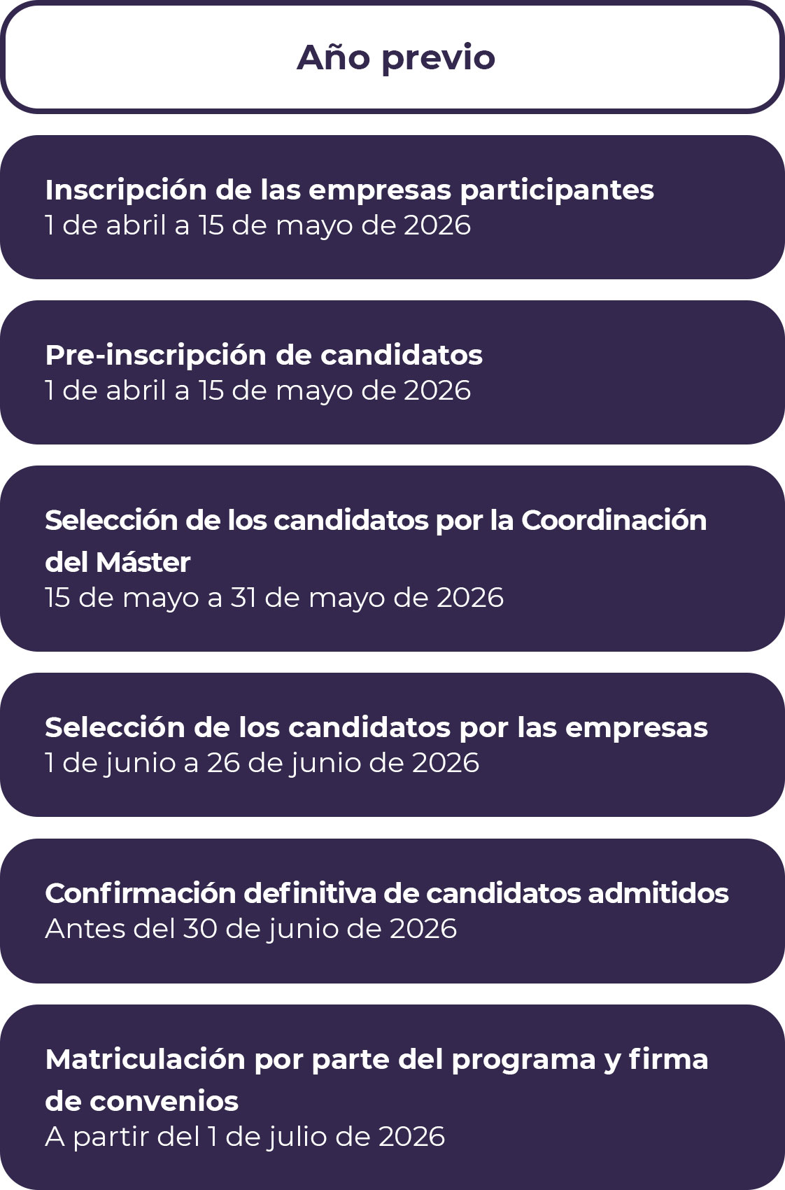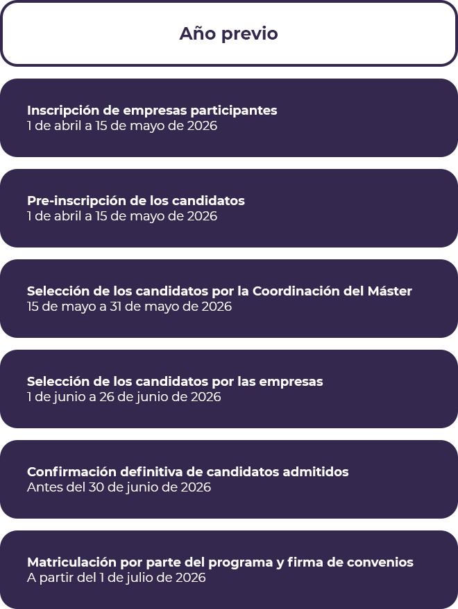 Los candidatos, en el momento de ser informados de su admisión en el programa, deberán firmar y enviar inmediatamente a la Coordinación un compromiso de aceptación de la plaza que se les ofrece. Este compromiso es indispensable para formalizar la aceptación, informar a la empresa que lo ha seleccionado y poder facturarles el importe de los dos años de matrícula del candidato. Una vez firmado el documento de aceptación, los candidatos admitidos deberán formalizar un procedimiento de preinscripción “online” en la web de la Escuela de Postgrado de la UAB y pagar la tasa académica correspondiente (aproximadamente 30 €). Formalizados estos trámites, los candidatos serán admitidos formalmente en el Máster y la gestora administrativa del programa procederá a su matriculación en las semanas siguientes, así como a la redacción de los convenios de colaboración con las empresas y su posterior firma por las partes implicadas.